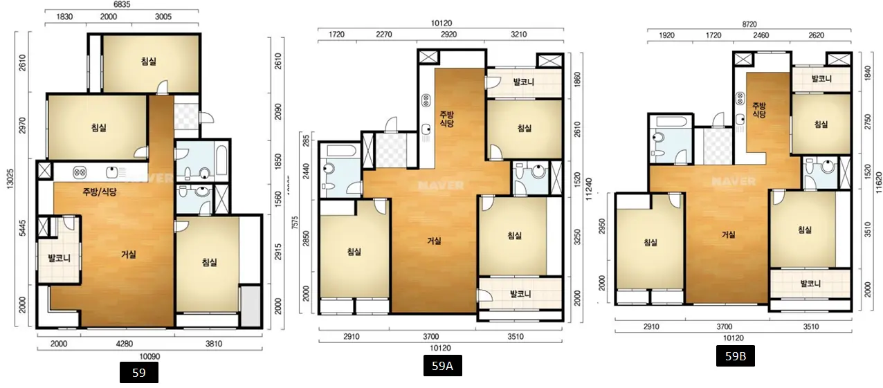 위 그림과 같이 59형(24평)은 3가지 평형이 있습니다. 59의 압도적인 크기가 보이시나요?