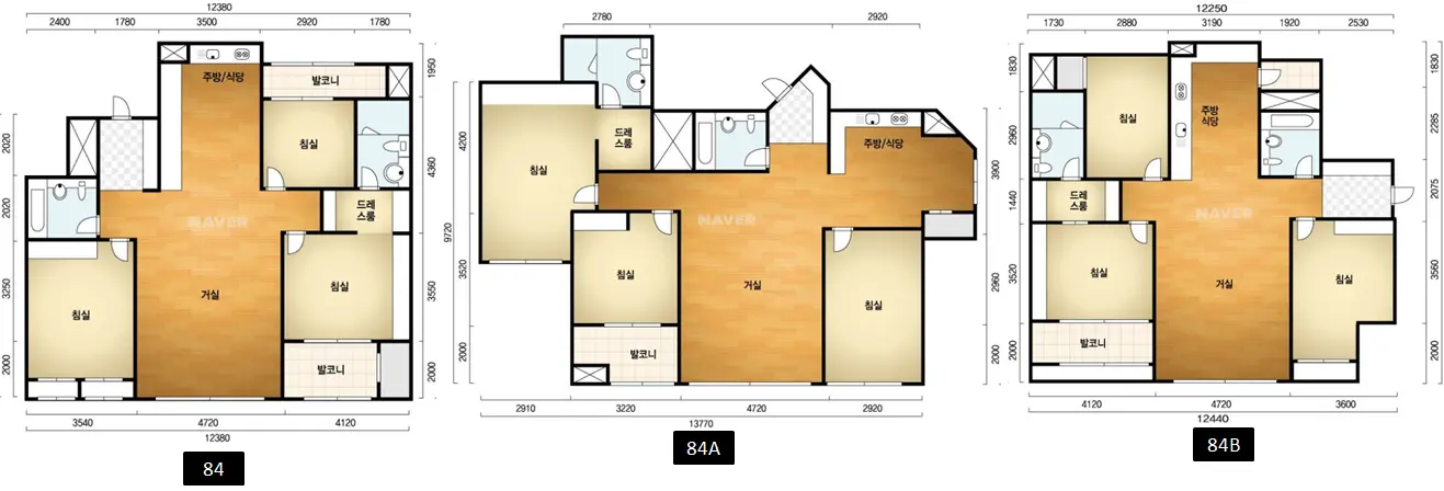 국민평형인 84형을 알아보겠습니다. 84형 역시 3개의 평형이 있습니다.